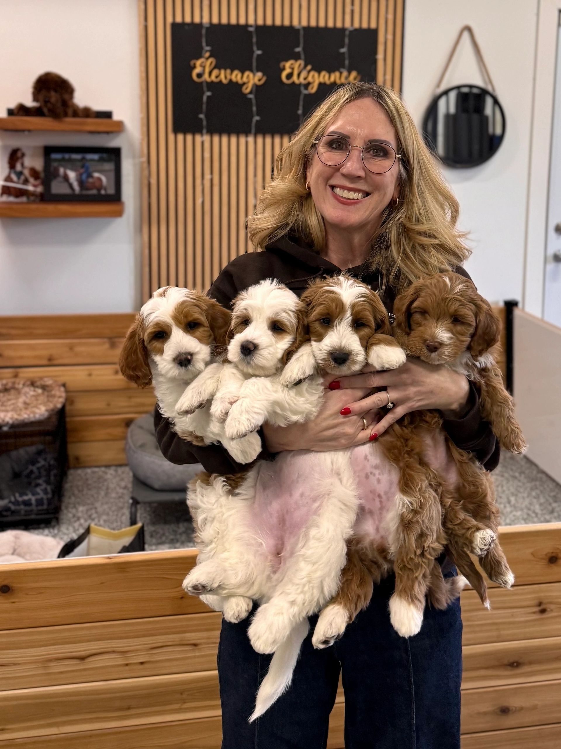 Chez Élevage Élégance, nous élevons avec soin des chiots Caniche, Goldendoodle, Maltipoo, Cockapoo et Bernedoodle en milieu familial.