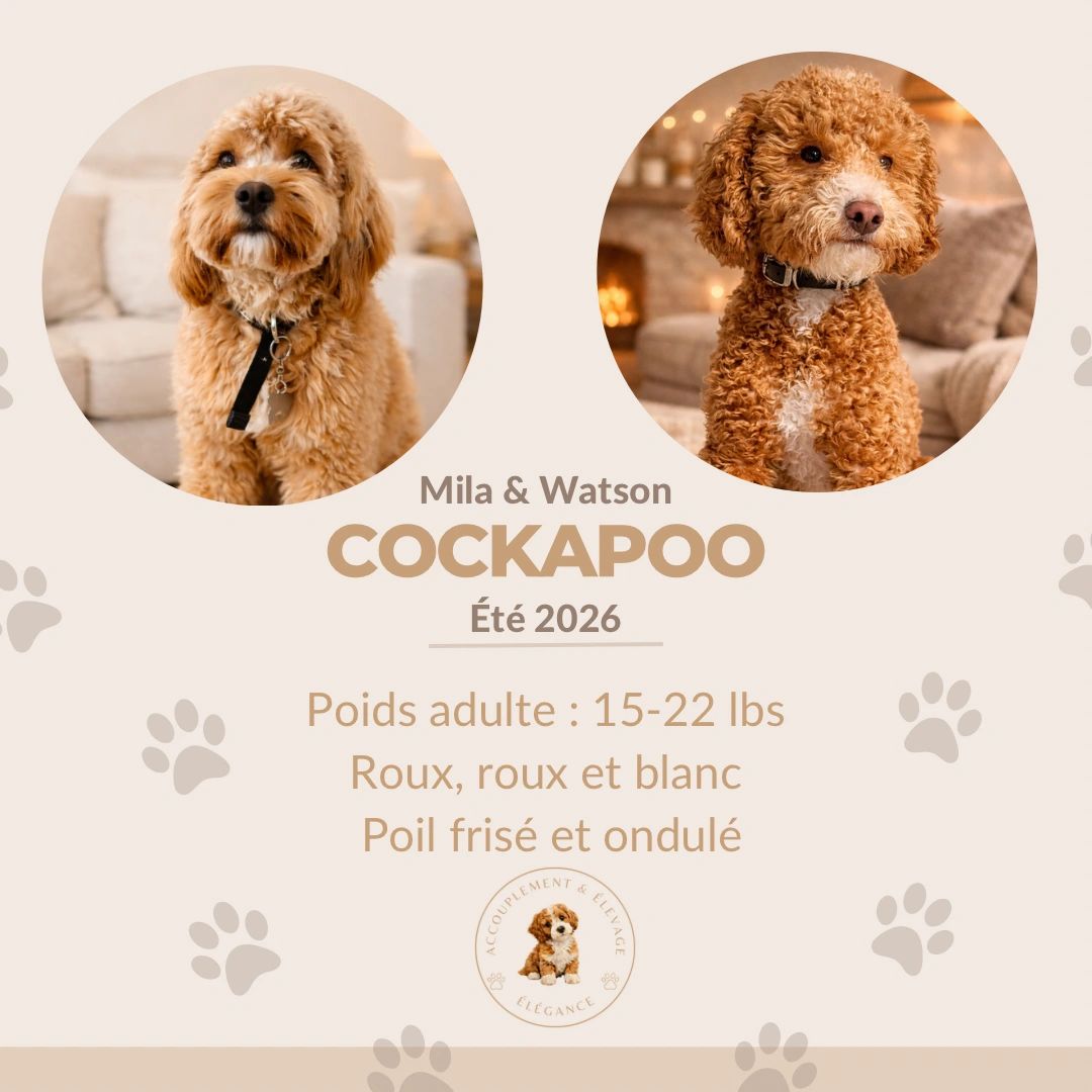 Cockapoo roux, roux et blanc qui seront disponibles vers l'été 2026.